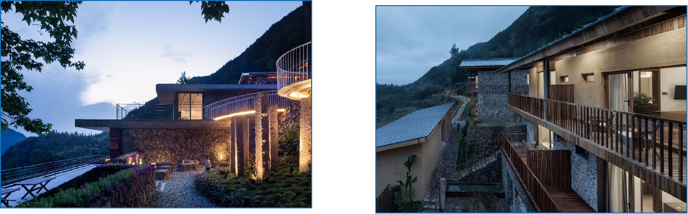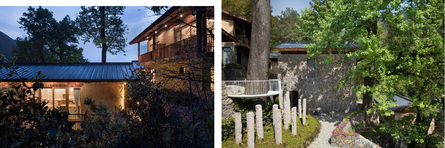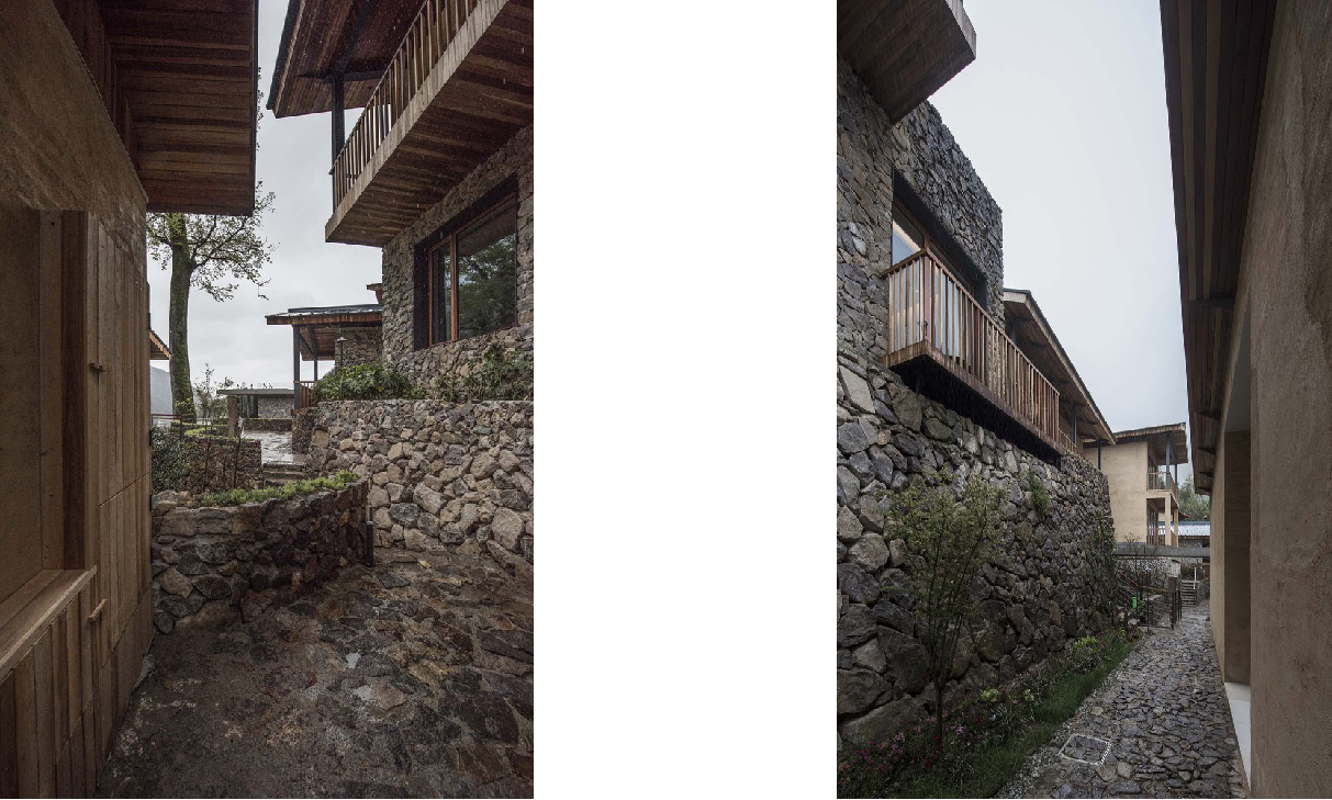 客房提取坡屋顶形制,材料以当地毛石和夯土为主,延续传统生活与文脉。
