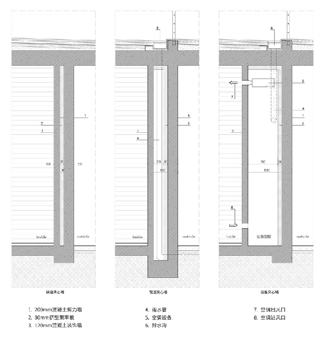 为满足保温标准,采用200(混凝土承重墙)+80(保温岩棉)+120(混凝土装饰墙)的夹心墙,为在不设吊顶的情况下隐藏管道与空调风口,在不影响空间效果的位置设计净宽600-1000的设备空腔,将空调等设备藏在里面。