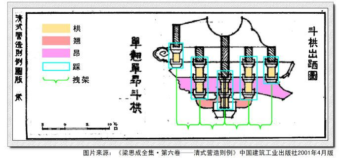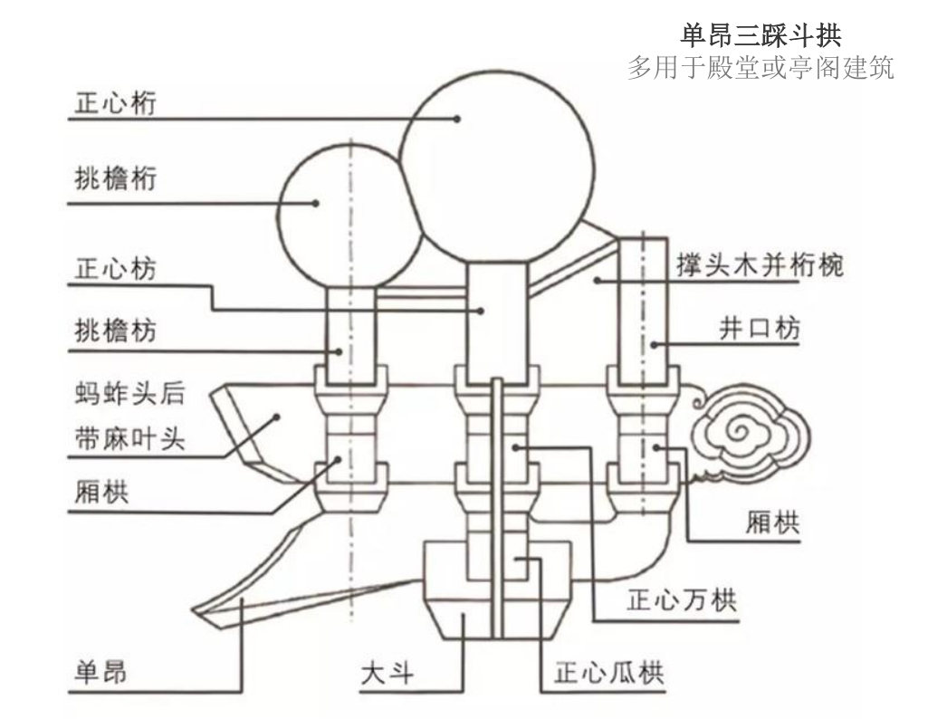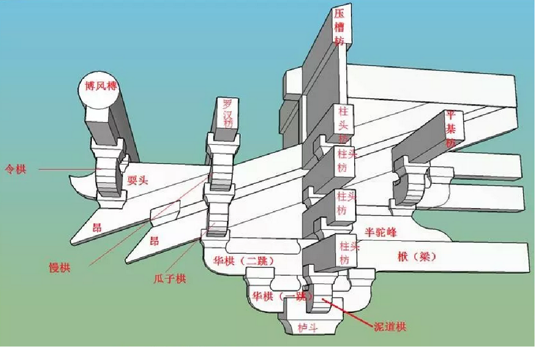 斗拱主要由五部分构成:斗、栱、翘、昂、其他类构件:
