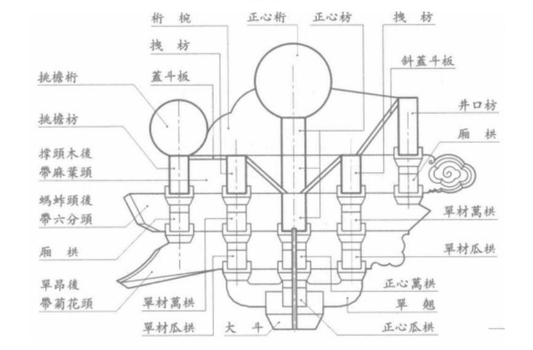 第六层:由桁椀、正心枋、井口枋、正心桁、挑檐桁组成。挑檐桁安装在第五层的挑檐桁之上,正心桁安装在桁椀之上。