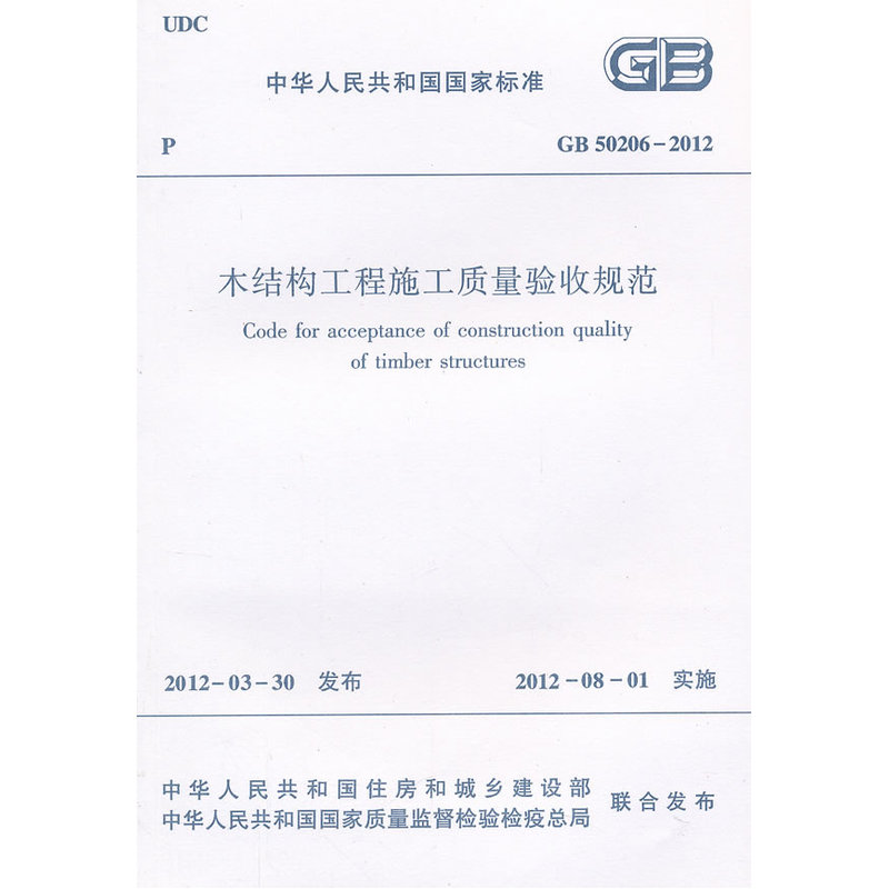 木结构工程施工质量验收规范 GB50206-2012 自2012年8月1日起正式实施。本规范用于指导木结构建筑工程中木材、其它材料,以及木结构框架和防腐等施工质量的验收。新修编的规范除对木结构工程材料验收提出要求之外,重点完善了对木结构工程施工过程质量控制和对木结构建筑的质量验收要求本规范来源于住房城乡建设部门户网站(www.mohurd.gov.cn)。封面PDF 下载链接